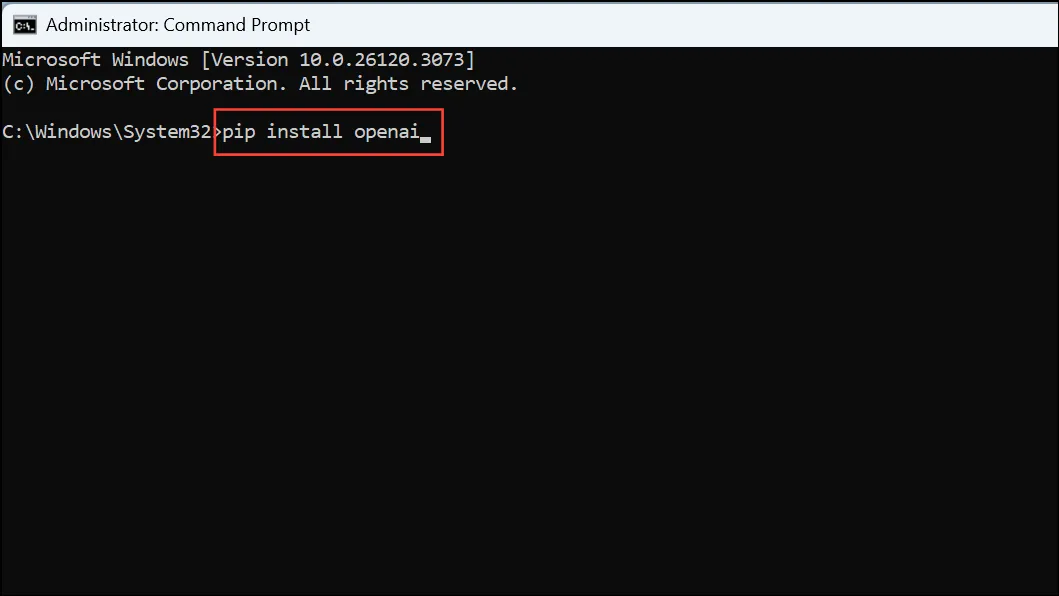 Шаг 2: Откройте командную строку и установите библиотеку OpenAI Python, выполнив: