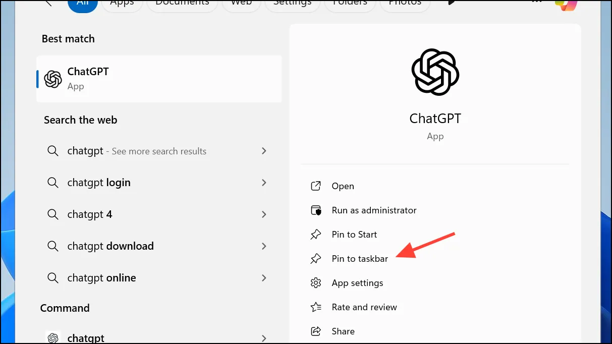Шаг 3: После входа в систему вы можете закрепить приложение ChatGPT на панели задач для более быстрого доступа. Щелкните правой кнопкой мыши значок приложения в меню «Пуск» и выберите «Закрепить на панели задач». Теперь нажатие Windows+[number]