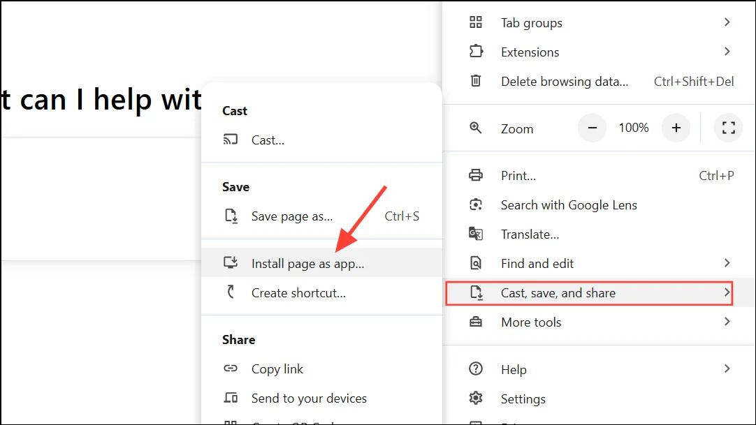 Шаг 2 (Chrome): Нажмите на значок с тремя точками, выберите «Транслировать, сохранять и делиться», затем выберите «Установить страницы как приложение». Подтвердите имя приложения и нажмите «Установить».