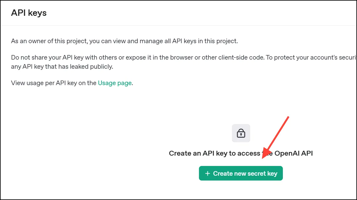 Шаг 3: Создайте учетную запись OpenAI и получите ключ API в разделе ключей API на панели управления учетной записью.