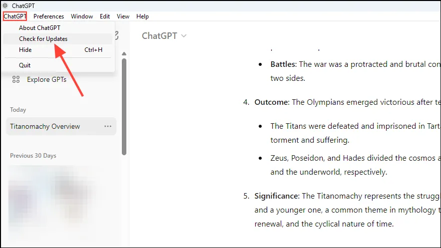 Настольное приложение ChatGPT автоматически обнаруживает обновления и информирует вас о них, чтобы вы могли их установить. Вы также можете обновить приложение вручную, щелкнув меню «ChatGPT» в левом верхнем углу, а затем выбрав опцию «Проверить наличие обновлений».
