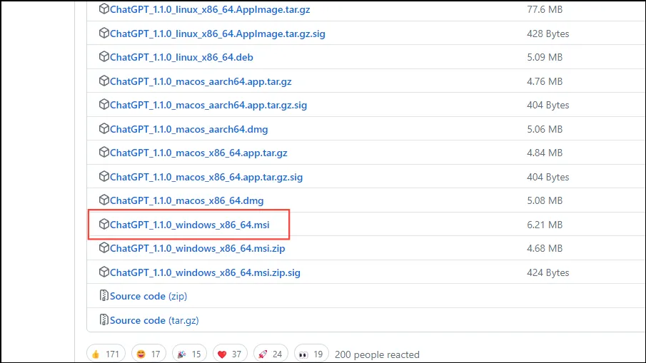 На странице «Загрузки» прокрутите список ресурсов и щелкните файл, ChatGPT_1.1.0_windows_x86_64.msi